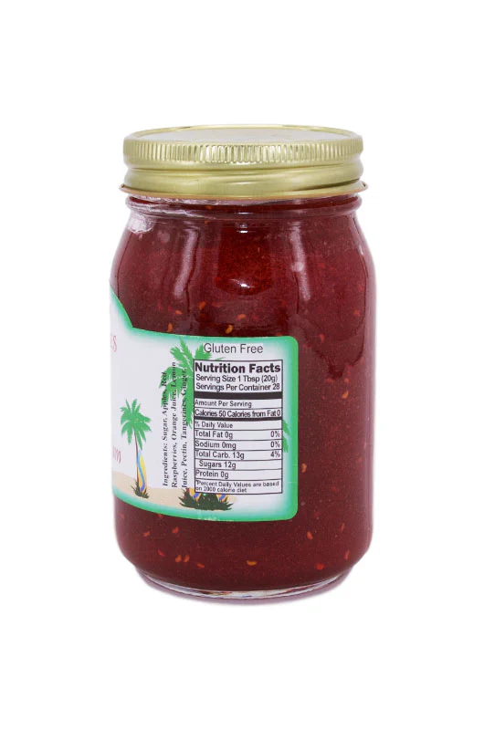 Ingredients: Sugar, Apples, Red Raspberries, Orange Juice, Lemon Juice, Pectin, Tangerines, Ginger.