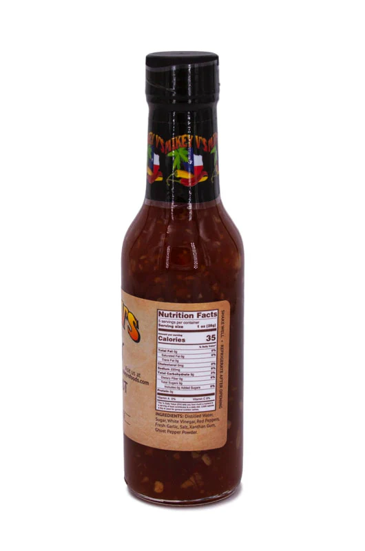 Ingredients: Distilled Water, Sugar, White Vinegar, Red Peppers, Fresh Garlic, Salt, Xanthan Gum, Ghost Pepper Powder